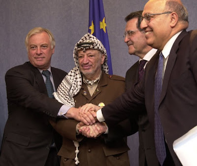 Brussels, May 2001: Patten in the company of Yasser Arafat, Romano Prodi and Nabil Shaath [Image Source] |