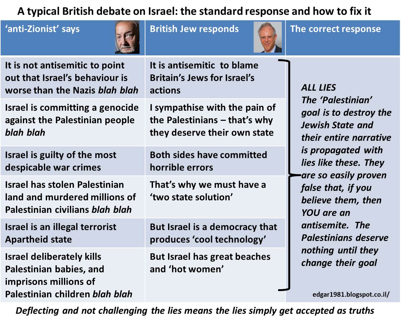 Following on from my post yesterday, here is a further simple summary. There’s really no need to ever listen to, or watch, a ‘debate about Israel/Palestine’ as it always follows this pathetic route. The ‘trembling Israelite’ response and what it should be.