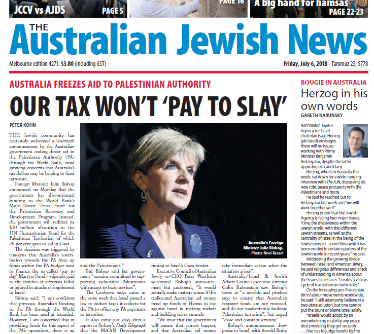 Executive Council of Australian Jewry co-CEO Peter Wertheim welcomed Bishop’s announcement but cautioned, “It would actually make matters worse if this reallocated Australian aid money freed up funds of Hamas to use against Israel in making rockets and building terror tunnels. “We trust that the government will ensure that cannot happen, and that Australian aid money will be applied directly only to projects that the PA or Hamas would not otherwise have to fund themselves, and from which they derive no political benefit.” Zionist Federation of Australia president Danny Lamm described Bishop’s decision as “a strong sign that the government is taking this issue very seriously and will take immediate action when the situation arises” …But Bishop said her government “remains committed to supporting vulnerable Palestinians with access to basic services”… [The announcement] came just days after a report in Sydney’s Daily Telegraph that the MA’AN Development Centre, a Palestinian organisation receiving Australian aid through Union Aid Abroad-APHEDA, an Australia trade-unions charity, employed Ahmed Abdullah Al Adine, a senior figure in the Popular Front for the Liberation of Palestine, which has a decades- long record of terrorism. Al Adine was killed in May during rioting at Israel’s Gaza border… Bishop’s announcement drew praise in Israel, with Arnold Roth, whose Australian-born daughter Malki was murdered by Palestinian terrorists in 2000, describing it as “completely justified”.