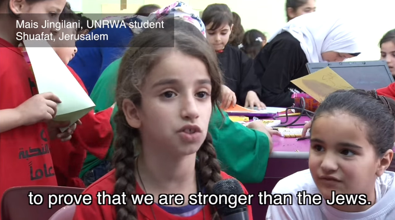 A little girl tells the interviewer in her UNRWA school in Jerusalem why they have to make war [Source: Video] |