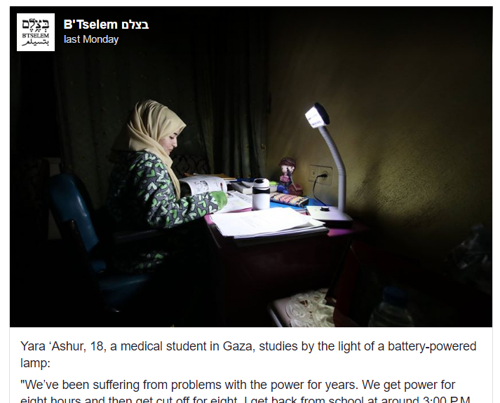 Our friends over at the excellent Israellycool noticed something else funny/outrageous about social media coverage of the Gazan electricity screw-up. In “B’Tselem Caught In Malicious (And Dumb) Lie” (February 28, 2017), Israellycool’s moving spirit, Aussie Dave, published a heart-tugging photo of an attractive young “medical student in Gaza [who] studies by the light of a battery-powered lamp… How does life without electricity, 90 minutes from Tel-Aviv, look like?” The photo and the text had been published by the campaigners at B’Tselem.