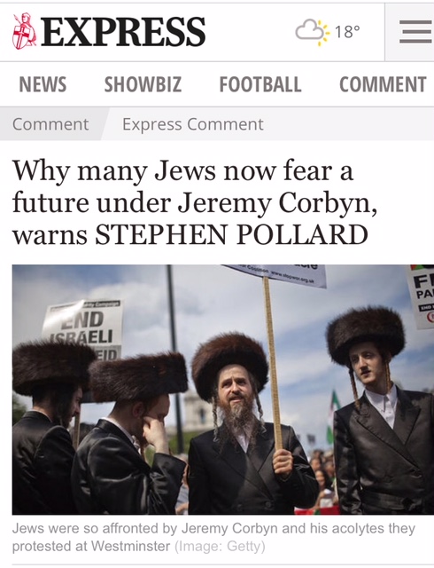 Look at the photograph and caption that the Daily Express used this morning for its article by Jewish Chronicle Editor Stephen Pollard about antisemitism:Contrary to what the caption says, the ‘Jews’ in the photo are the fanatics of Neturei Karta and you can clearly see their anti-Israel placards. But hey – as far as the Express is concerned – ‘Jews with beards, payers, and big furry hats who hate Israel’ are obviously typical of British Jews concerned about Corbyn’s anti-Israel driven antisemitism.