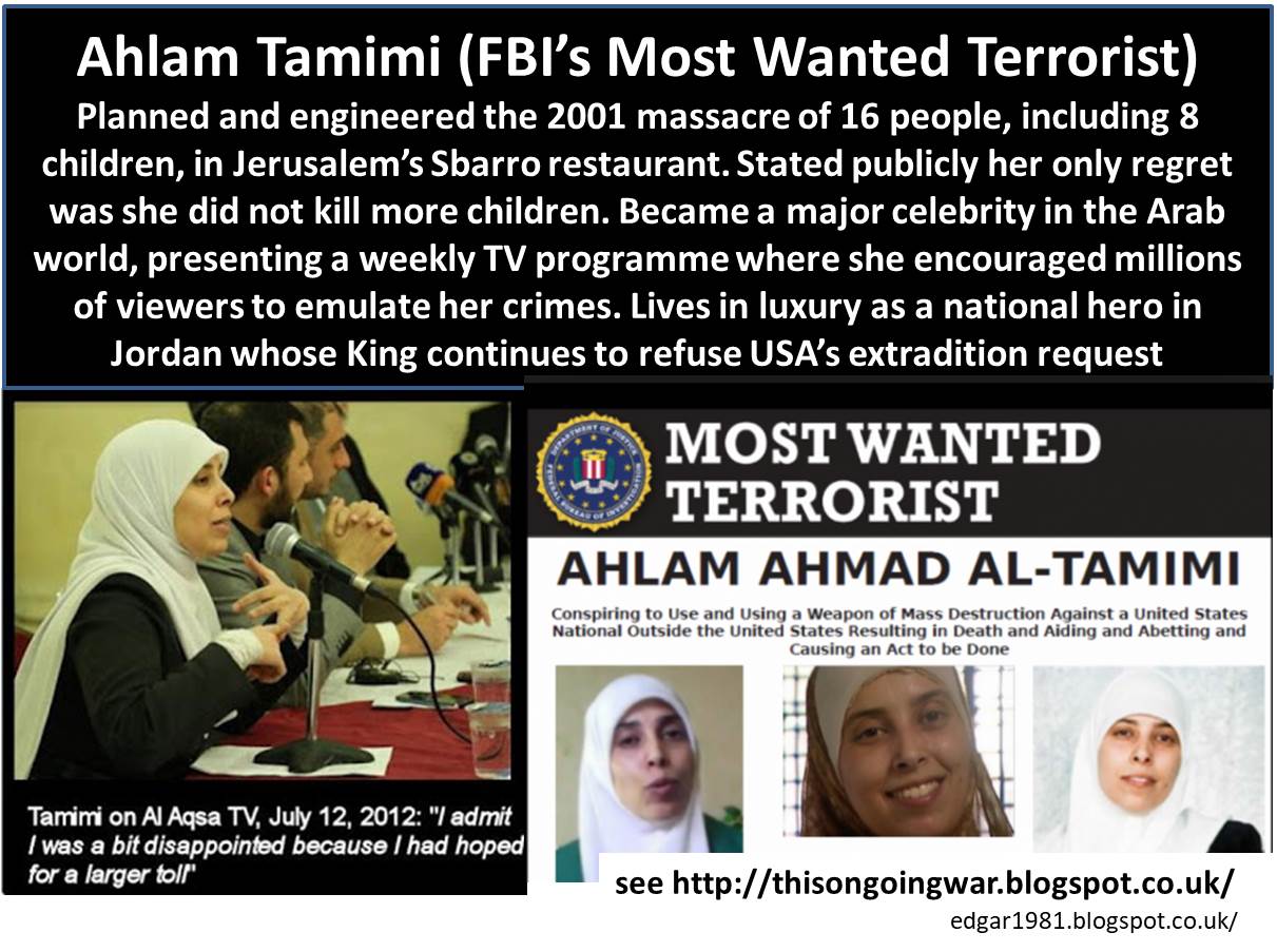 As a mass murderer of Jewish kids she was the most ‘honoured’ of all the terrorists released in the ludicrous exchange for Gilad Shalit. She became a major celebrity in the Arab world, presenting a weekly TV programme where she encouraged millions of viewers to emulate her crimes. By inciting terrorism Tamimi was subject to re-arrest under the terms of the release, but by living in Jordan the Israelis were unable to re-arrest her. However, because two of her victims were American citizens the FBI has recently put Tamimi on their most wanted terrorist list and requested her extradition from Jordan. The Jordanians, who also recently honoured child murderer Ahmad Dakamseh, have refused.