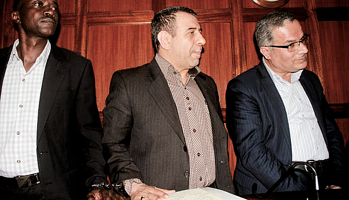 The arrested Iranians with their Kenyan driver, in the dock of the court and in handcuffs in a December 3, 2016 Reuters photo [Source] |