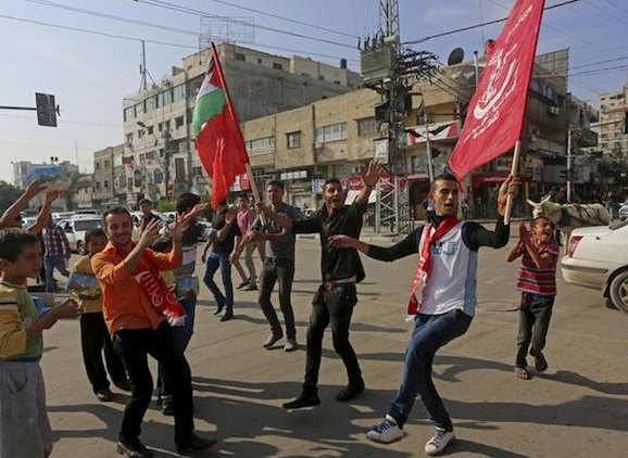Gazan Palestinian Arabs dance for joy as word gets out of a terrorist massacre in a Jerusalem synagogue, November 18, 2014 [Image Source: AP] |