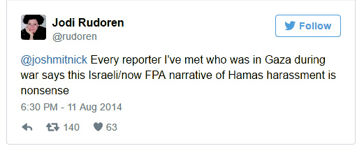 And did we mention that in rejecting the idea of Hamas harassment and calling it nonsense, Ms Rudoren of the New York Times confessed she had not even been physically present in Gaza at any of the relevant times?