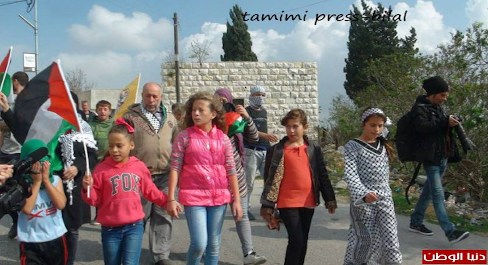 November 21, 2014: AlwatanVoice publishes one of the many Tamimi Press snapshots of the Tamimi village children boldly marching to another entirely artificial “clash” with Israeli soldiers. As always, Ahed Tamimi is placed by her father in the most photographed position. Right behind her is Naji Tamimi, a full-time paid Fatah “activist” and cousin or brother (according to different sources) of Bassem Tamimi