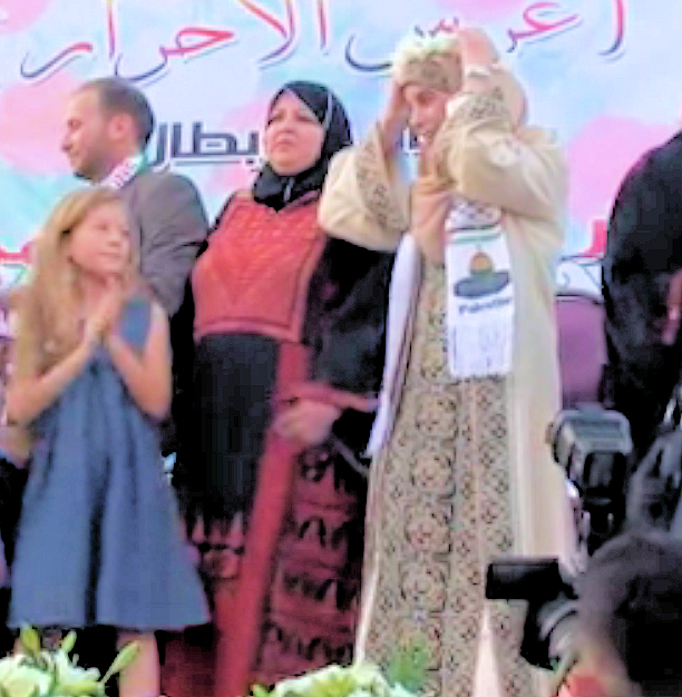 June 16, 2012: Ahed Tamimi stands on stage in Amman, Jordan, next to Nabi Saleh’s pride and joy, the boastful and confessed murderer Ahlam Tamimi who is marrying another Nabi Saleh murderer, Nizar Tamimi, also in the photo. Everyone in the picture is a blood-relative of everyone else. Background: “22-Jun-12: A wedding and what came before it“