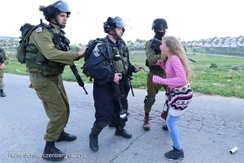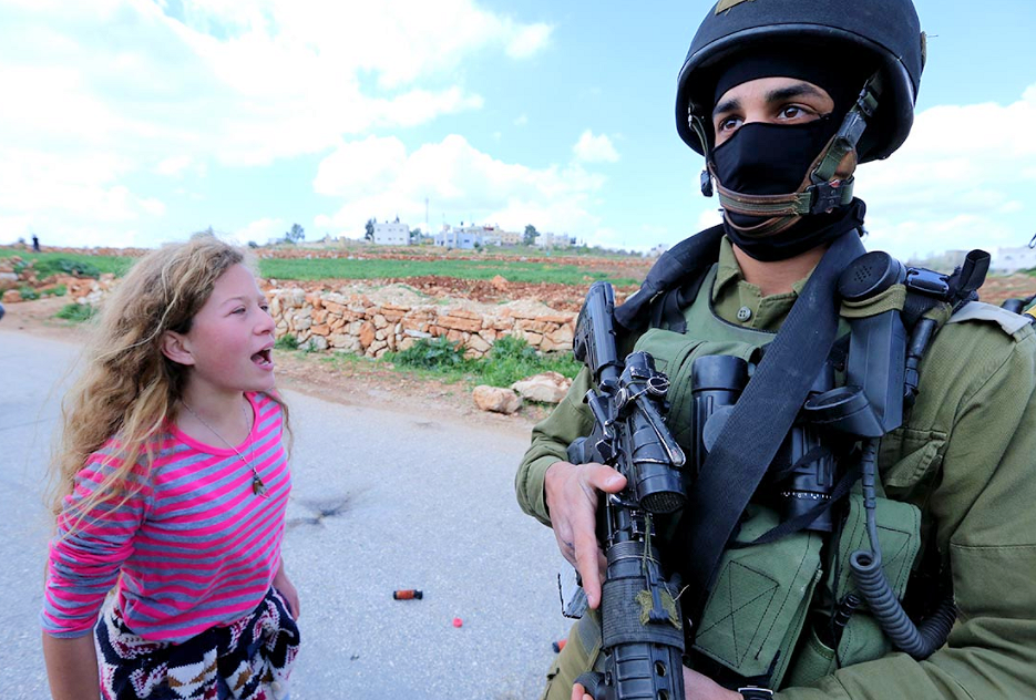2014: She and her flowing blonde tresses are center stage in a depiction of “resistance and human rights”. The Israeli soldiers in the picture are familiar with the game – the child is not at risk because the uniforms are Israeli. Everyone involved knows that anywhere else in the Middle East, the outcome would be radically different [Image Source]