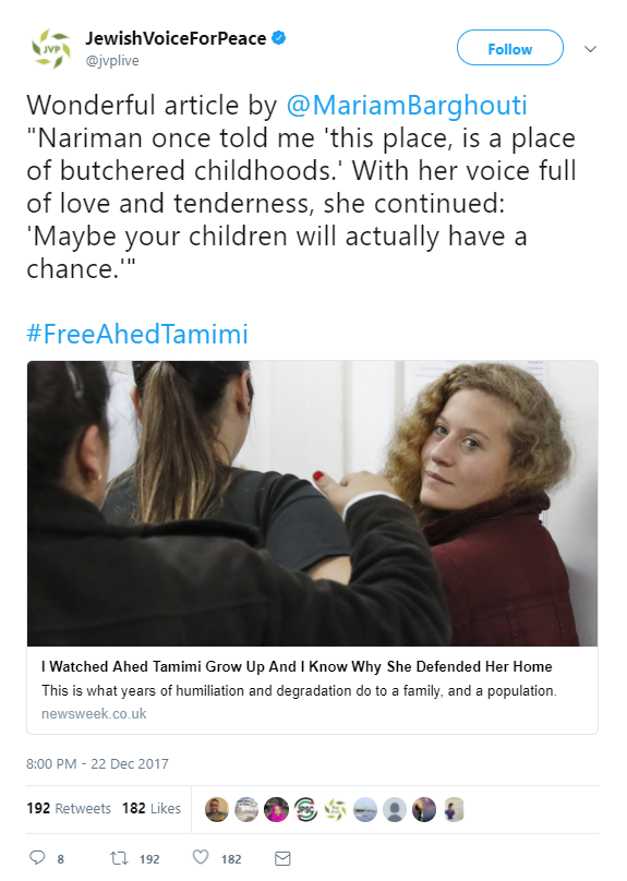 The radicals of the terribly-mislabeled Jewish Voice for Peace are currently hard at work amplifying the Nabi Saleh/Tamimi Press messages and issued a tweet on Friday (below) that left us wondering what planet they occupy: