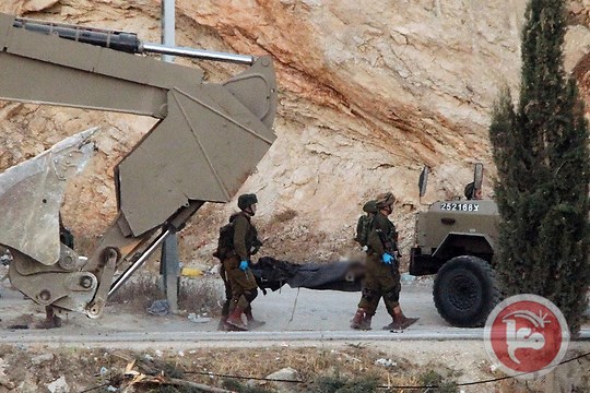 In the PA-controlled village of Surif this morning, the body of a terrorist gunman is removed by IDF soldiers [Image Source] |