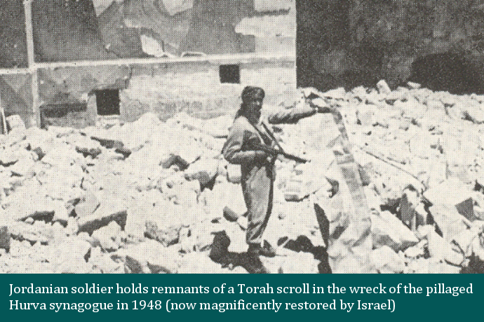 Half of this city was captured by the army of the Jordanian king during Israel’s desperate war of survival in 1948. Jordanian forces then set about destroying and desecrating anything Jewish on which they could lay their hands. The United Nations and other international agencies (to their eternal shame) did nothing to prevent or condemn this or the fact that the Jordanians prohibited access by Jews to all of the holy sites under their control. Then, in an unconscionable act of self-tribute, the Jordanian king built himself a large mansion on a Jerusalem hill-top that we can see as we type these words. Ostensibly a tribute to his dominion over a city holy to three religions, it serves as an indictment of his hypocrisy and that of the nations of the world who were evidently content with what was done by and in the name of the Hashemite regime to eastern Jerusalem and its historical and religious uniqueness during those nineteen miserable years.