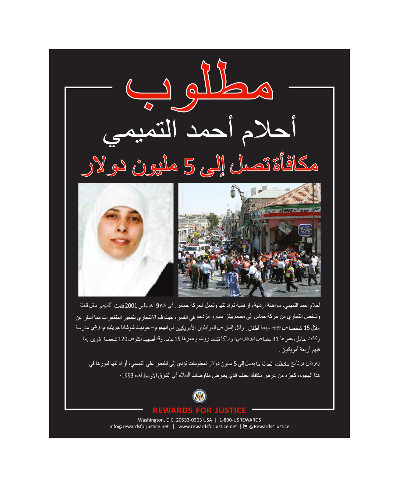 The Rewards for Justice Program is offering up to $5 million for information leading to al-Tamimi’s arrest or conviction for her role in this attack, as part of the 1993 Violence in Opposition to the Middle East Peace Negotiations reward offer… Hamas has been designated by the Department of State as a Foreign Terrorist Organization (FTO) under the Immigration and Nationality Act and as a Specially Designated Global Terrorist (SDGT) entity under E.O. 13224. [Source]