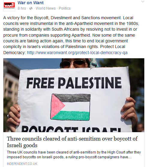 Needless to say, the BDS crowd (including War on Want) are cock-a-hoop at the judge’s decision. As gleefully reported here: