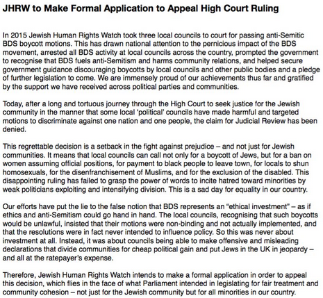 Founded in Britain at the end of 2014, Jewish Human Rights Watch JHRW) first came to public attention when, as I mentioned at the time, it mounted a demonstration outside the anti-Israel NGO War on Want. More recently, they sponsored a full-page ad in The Guardian in response to one advocating an academic boycott of Israel. They have also sought judicial reviews against local councils passing BDS resolutions (Leicester City Council, Swansea City Council and and Gwynedd Council) alleging that those resolutions breached equality law requirements, and “failed to have regard “to the need to eliminate discrimination and harassment of Jewish people”.