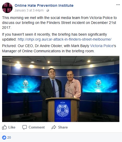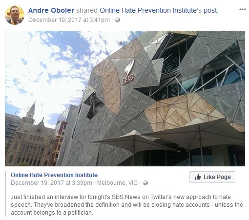 What would appear to be its increasing focus on right-wing “hate speech” seems to be borne out by a recent article by the OHPI’s CEO (and, whisper it softly, sole staffer?) Dr Andre Oboler on the Jewish website J-Wire: