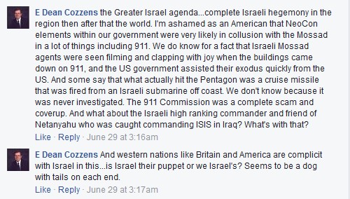 Surely, in view of his own notorious brush with the “Israel did 9/11” trope, Stephen Sizer should long since have given a Facebook friend and commentator like this (and Cozzens is not the only one) the old heave-ho.