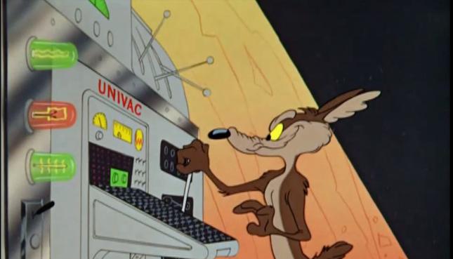 Fellow Bugs Bunny fans will remember that episode as the one in which the aforementioned villain decides to supplement his “super genius” with a build-it-yourself, cave-sized, UNIVAC electronic brain, complete with my favorite cartoon interface of all time: a mammoth keyboard in which each key features one word in the English language (including contractions), allowing him to give commands such as: