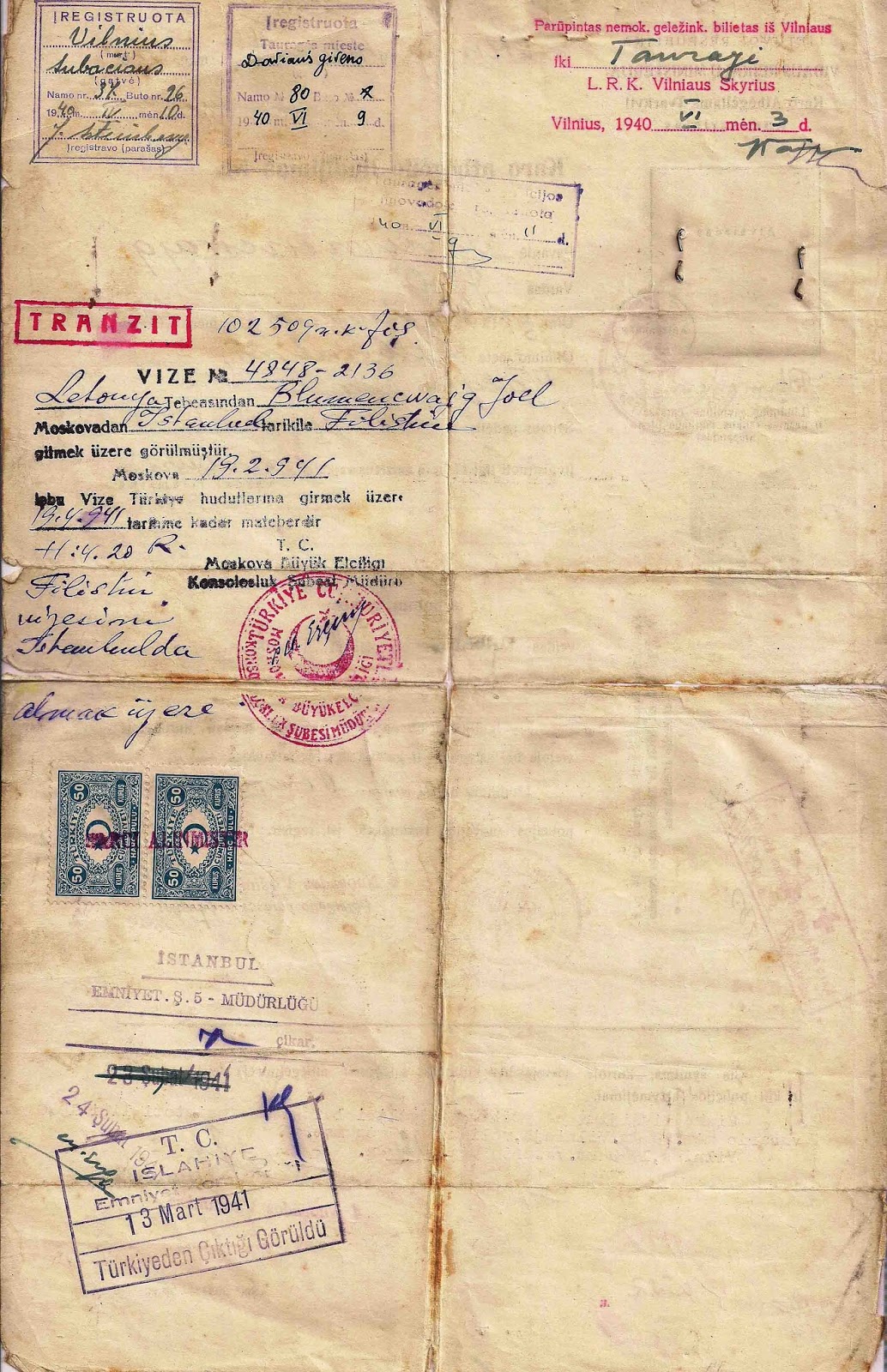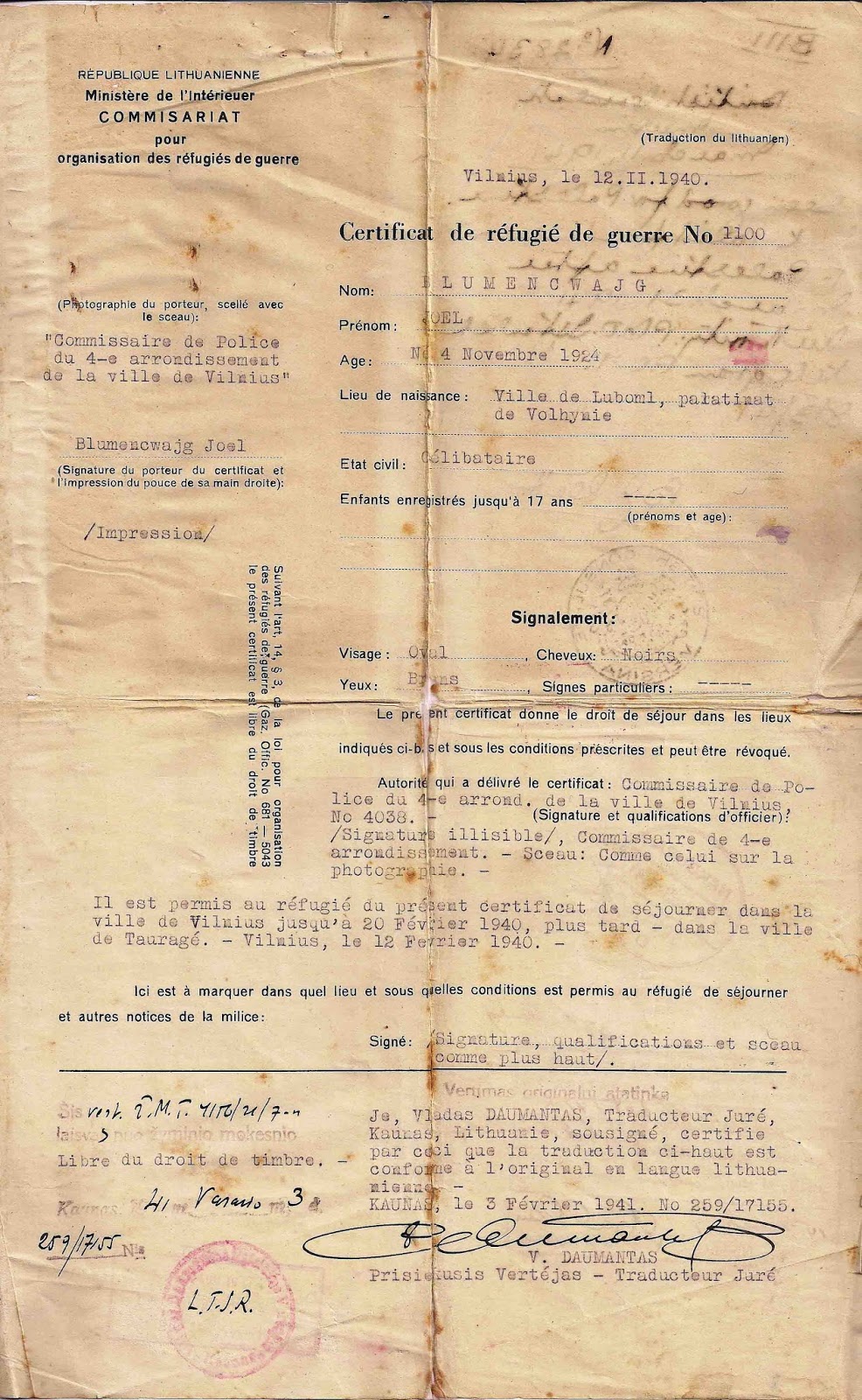 Some though managed to obtain other means to flee occupied Lithuania as the holder of this set of documents here did: JOEL BLUMENCWAJG, a young man, obtained the rare “War Refugee Certificate” from the Lithuanian Ministry of Interior, the” Commissioner for War refugees”. The document was translated into French by the well-known Lithuanian dignitary Vladas Daumantas, then acting Kaunas County Court jury translator, who had a rich contribution to the founding of the country after World War One. The certificate was obtained prior to the occupation but put into use afterwards. Young Joel, who found refuge in the small town of Tauragė, transited through Moscow, Turkey & Syria to arrive safely into British Palestine on March 15th, 1941, after crossing the border checkpoint at Nakoura.