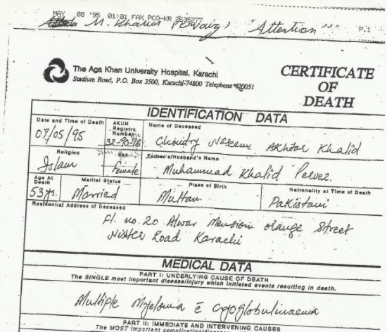 Mrs Benkhald’s death certificate : According to her son Mohammed, she is a Muslim Punjabi, not an Iranian Jew.