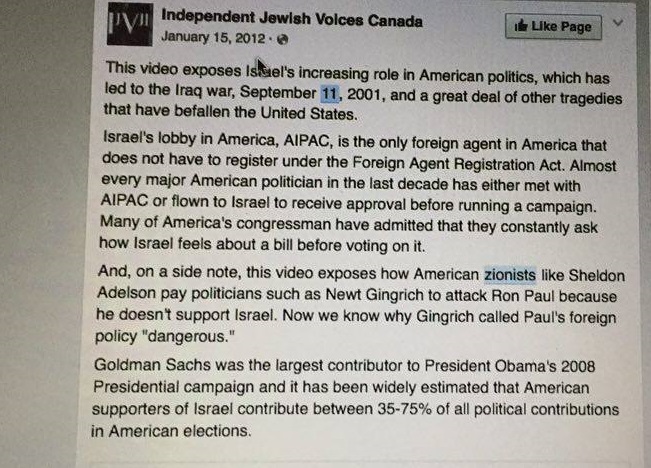 Even without VT’s adding the explicit Holocaust denial to Hart’s article, IJV’s defense of Alan Hart as a “widely-respected journalist and Mid-East expert” betrays its fringe agenda. After Bnai Brith Canada pointed out that Hart peddles outrageous 9/11 conspiracy theories, IJV added that they don’t support that part of Hart’s oeuvre. Yet they still defend him and call him “widely respected.”