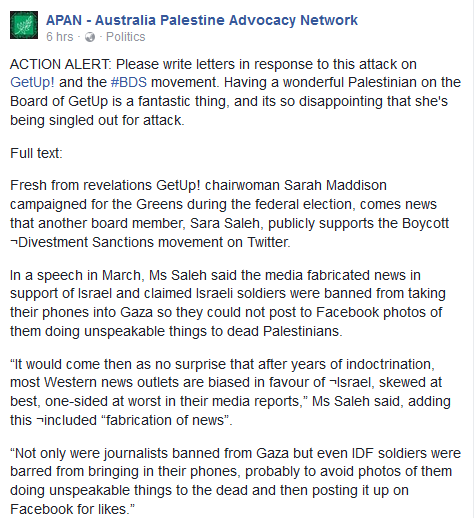 Fresh from revelations GetUp! chairwoman Sarah Maddison campaigned for the Greens during the federal election, comes news that another board member, Sara Saleh, publicly supports the Boycott Divestment Sanctions movement on Twitter.