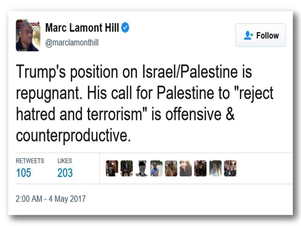 Earlier this month, Hill opinedon Twitter that “Trump’s position on Israel/Palestine is repugnant. His call for Palestine to ‘reject hatred and terrorism’ is offensive & counterproductive.”