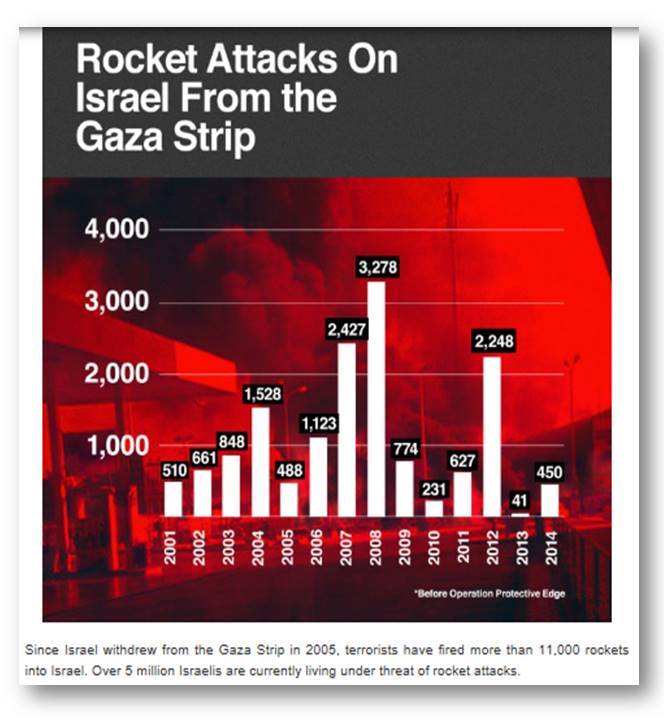 Well, actually, in August 2014, when Hill declared his opposition to the occupation of Gaza, it was just a few weeks to the ninth anniversary of Israel’s complete withdrawal from Gaza – which, Israelis hoped, would reduce hatred and terrorism and perhaps even be a major step towards a peace agreement. It didn’t work out as hoped: “Since Israel withdrew from the Gaza Strip in 2005, terrorists have fired more than 11,000 rockets into Israel [until 2014].”