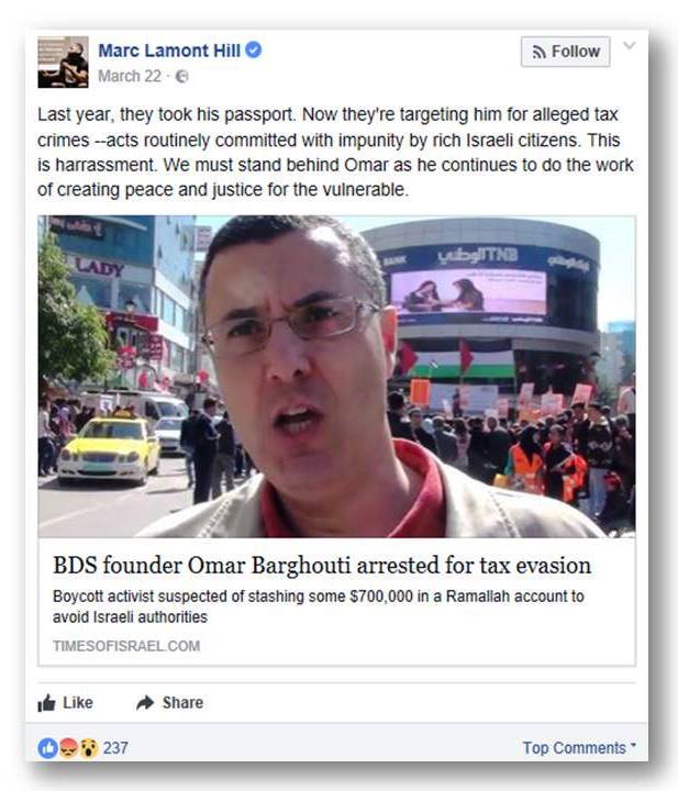 Needless to say, Hill is also an ardent BDS supporter, and the goal of BDS is of course to rid the world of its only Jewish state. As Hill’s good friend, BDS leader Omar Barghouti put it so hopefully all the way back in 2004, when he denounced the two-state solution as an immoral ploy to save Zionism and eagerly anticipated “the final chapter of the Zionist project:” “We are witnessing the rapid demise of Zionism, and nothing can be done to save it, for Zionism is intent on killing itself. I, for one, support euthanasia.”