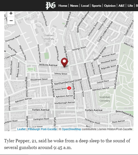 I took a screenshot of the Google map at the Pittsburgh Post-Gazette with its marker showing the location of Tree of Life. I added a small red circle to show where the home I grew up in was situated relative to the synagogue. I wanted to show my family members. “Look how close I lived to what has happened!”