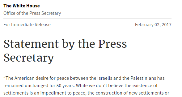 But while the White House has not given Israel carte blanche to build settlements anywhere, this is the first official White House statement on the issue – and it is a massive sea change from what the Obama administration has stated.