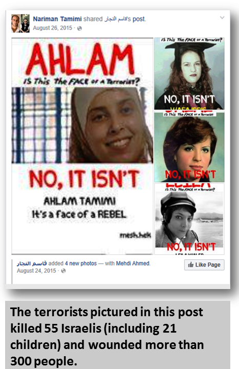 So let’s not forget that for Ahed’s mother Nariman Tamimi, her daughter’s aunt Ahlam Tamimi – who planned and facilitated the Sbarro bombing and was deliriously happy about the carnage it wrought – is not a terrorist, but an admirable rebel.