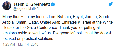 Convened by White House Senior Advisor Jared Kushner, Special Representative for International Negotiations Jason Greenblatt, and members of the National Security Council (NSC) staff and the Department of State – the Conference was attended by representatives from the United Nations, the European Union, the Office of the Quartet, and the following countries: Bahrain, Canada, Cyprus, Egypt, France, Germany, Ireland, Israel, Italy, Japan, Jordan, Kingdom of Saudi Arabia, Netherlands, Norway, Oman, Qatar, Sweden, Switzerland, United Arab Emirates, and the United Kingdom.