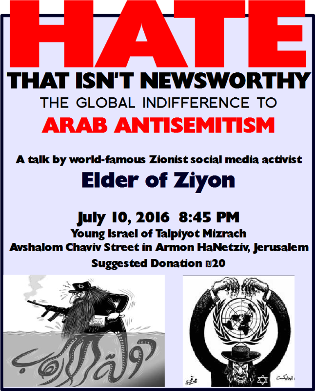 I will be giving a talk on Arab antisemitism and why NGOs, the media and politicians largely ignore it.