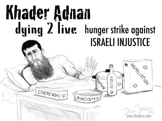 Khader Adnan is an Islamic Jihad leader whose 2012 hunger strike was a cause celebre, with his face plastered over posters and his “heroic” story published in pan-Arab and Western media. People made political cartoons about him. Masses rallied for him.