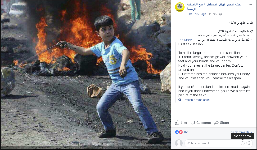 The official Fatah Facebook page shows a photo of a child with a slingshot, with a fire burning behind him, giving instructions for children like him on how best to attack Israelis. This screenshot shows the automatically translated part.