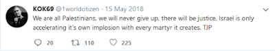 This pro-Arab pro-BDS elderly guy‘s Facebook page is full of swipes against Israel, which in at least one post he repeatedly refers to as Izzie-land. (Bit antisemitic, eh?) He’s fond of posting an image of the Israeli flag with a Stop sign through it. Here, he links to a recent article that he wrote: