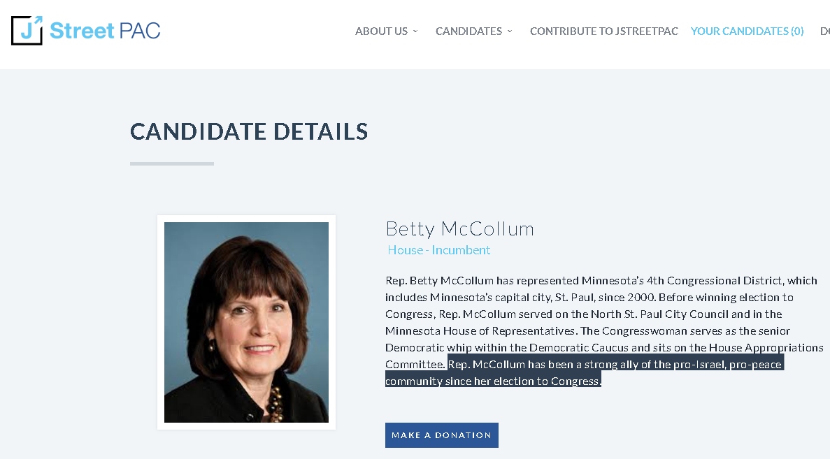 Naturally, J-Street is an enthusiastic supporter of Betty McCollum, claiming that she “has been a strong ally of the pro-Israel, pro-peace community since her election to Congress.”