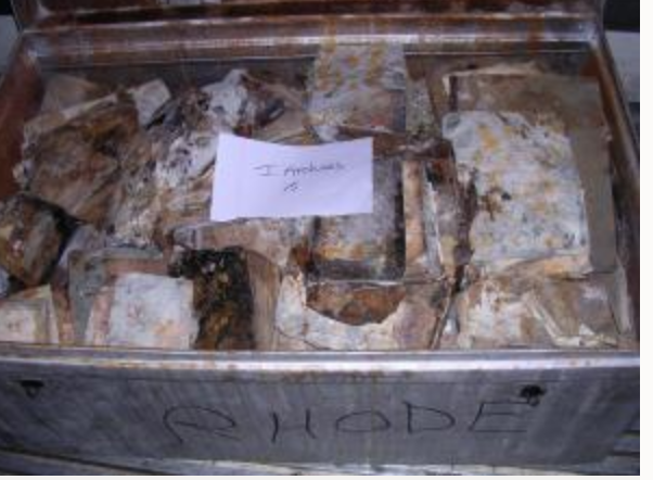 A crate of waterlogged items from the Iraqi-Jewish archive. The crate was marked with the name of Harold Rhode, an orthodox Jew working for the Pentagon in Baghdad in 2003, who first drew attention to the archive.