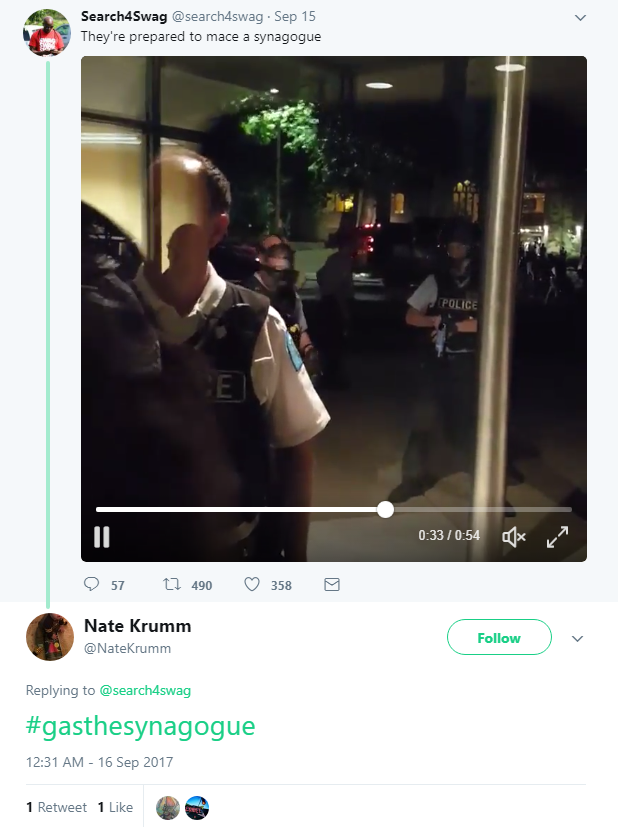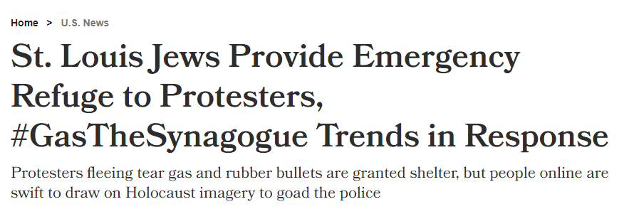 As penned-in protesters piled in, the St. Louis Metropolitan Police reportedly surrounded the synagogue and prepared to fire tear gas at those who had taken refuge within. The night’s goings-on being widely shared live on social media, a Twitter hashtag calling for the police to breach the Jewish house of worship began to trend: #GasTheSynagogue.