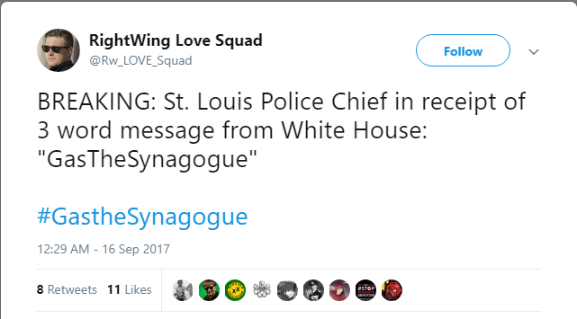 This story was picked up and repeated in other media as if there were hundreds of Nazi Tweeters all calling to gas the St. Louis synagogue.