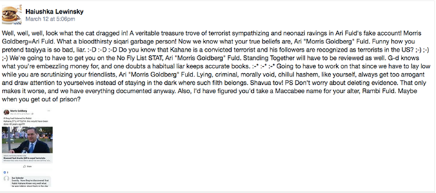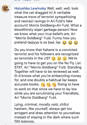 Indefatigable pro-Israel blogger Ari Fuld has also been put in Facebook jail numerous times. Like Ryan and like my husband, Ari has discovered the workaround is each time creating a new Facebook profile. But the troll watches out for and targets the new profiles, encouraging others to follow suit: