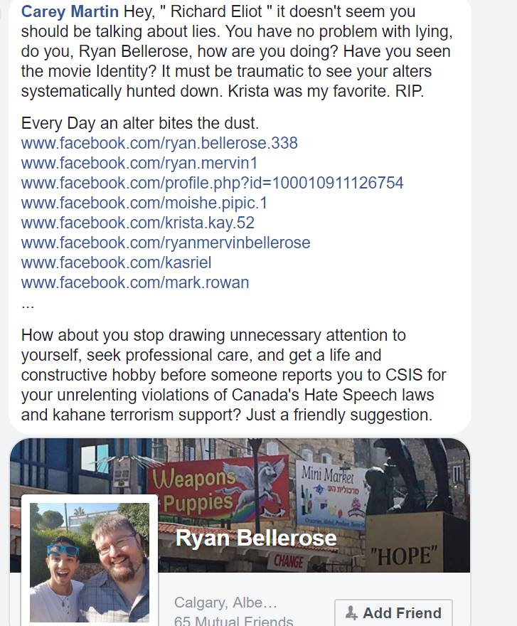 By the way, Ryan tells me he only uses his own name for the Facebook profiles he creates. Mark Rowan and Krista Kay are real people in their own right. The troll is not just a troll, but a paranoid troll at that.