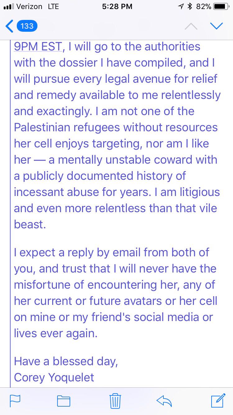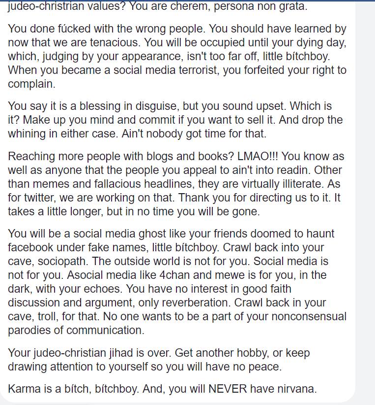 Here is the troll using another alias, laughing at Ryan, bragging in an obscenity-laced screed of his prowess in silencing Ryan’s important voice for Israel .
