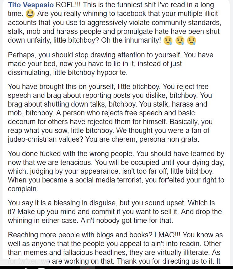 “Thing is that as soon as I go out of FB jail I go right back in so obviously someone is watching my posting pattern and when he (or she) sees I don’t comment anymore, wait for a month and then reports again so I am almost continuously in FB jail.