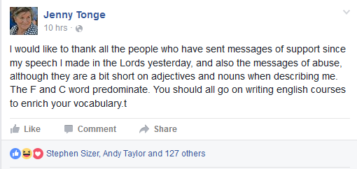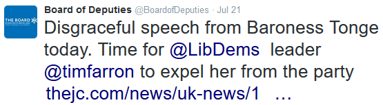 Among those liking the Baroness’s speech and subsequent defiance are a certain Andy Taylor (whose numerous posts on Facebook leave little doubt of his feelings towards da Joos), as well our old friend the vicar of Virginia Water, Stephen Sizer, as yet, since his return to Facebook following banishment by his bishop over that notorious Israel and 9/11 post of his, venting his hostility to Zionism through pressing the “Like” button on other anti-Zionists’ proclamations rather than pontificating himself: