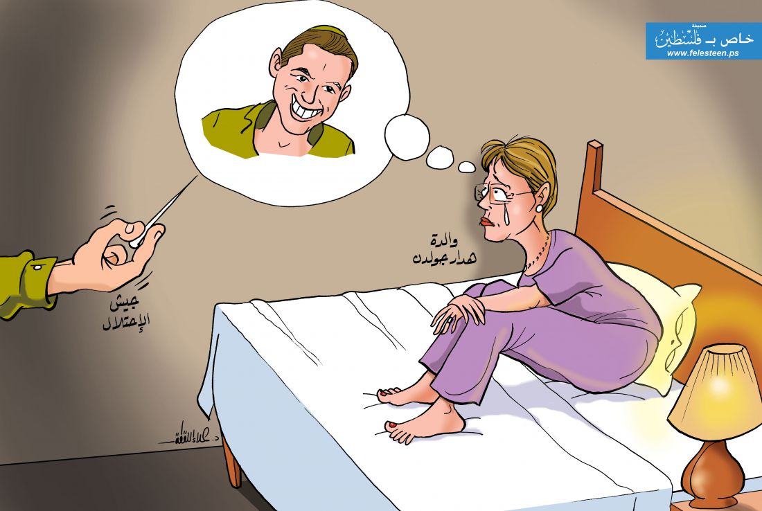 The cartoon shows the IDF (“Occupation Army”) about to destroy the dreams of Goldin’s mother that he can be returned home.