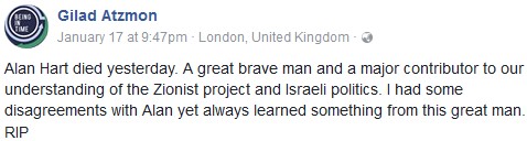 As many readers will know by now, Alan Hart is no more. Aged 75, the (non-Jewish) inveterate Israel-demoniser, whose Twitter page shows that he was tweeting anti-Israel propaganda almost to the end, shuffled off this mortal coil last week, deeply mourned by inveterate Israel-demoniser Gilad Atzmon (see, for instance, here) and others of that ilk.