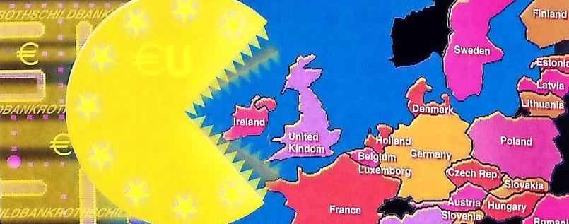 The cartoon shows a video Pacman figure devouring Europe, with the Jewish banking family named next to the cartoon.