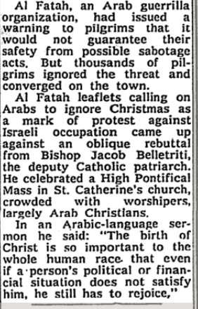 Fatah, the dominant party in the PLO, explicitly warned and threatened Christian tourists in 1967 and 1968. And Christian leaders, under Israeli rule, were confident enough to tell the world to ignore the terrorists and come anyway, even though some were scared off. And Israel took drastic steps to reduce the chance of terror attacks by banning non-Christians from Bethlehem.